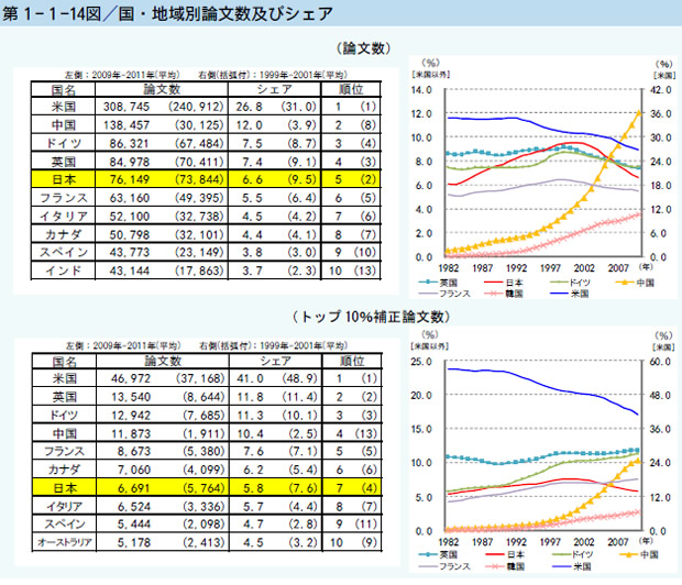 このように、研究論文の量、質的の該当数について、我が国は着実に増加させているものの、 他国の伸びはこれを大幅に上回ることからシェアや順位を落としており、世界の研究活動におけ る我が国の存在感の低下が示唆される。