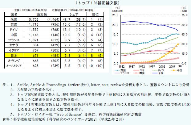 また、質的な指標である被引用数についても、被引用数が上位10%に入る注目度の高い論文 の数(トップ10%補正論文数)や、被引用数が上位1%に入る注目度の非常に高い論文の数(トッ プ1%補正論文数)においても、世界シェアが低下傾向を示している(第1-1-14図)。